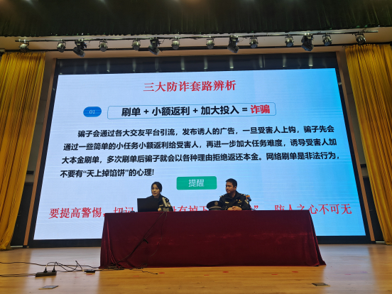 本次講座圍繞三個(gè)方面展開,一是結(jié)合案例詳細(xì)介紹了電信網(wǎng)絡(luò)詐騙慣用的手段、途徑,分析了受害人的心理活動(dòng)和思維邏輯,提醒各位同學(xué)要提高警惕,不輕信來歷不明的電話、信息;對(duì)詐騙人的花言巧語、危言恐嚇“不聽信、不轉(zhuǎn)賬、不匯款”;遇到可疑情況及時(shí)撥打報(bào)警電話,謹(jǐn)防上當(dāng)受騙。二是提醒學(xué)生不要為貪圖小利對(duì)外出租、出售、出借銀行卡、電話卡及各種互聯(lián)網(wǎng)賬號(hào),保護(hù)好個(gè)人信息,避免成為電信網(wǎng)絡(luò)詐騙犯罪活動(dòng)的“工具人”。三是總結(jié)防范“電信詐騙” 牢記十個(gè)“凡是”,提高學(xué)生防詐騙的意識(shí)。