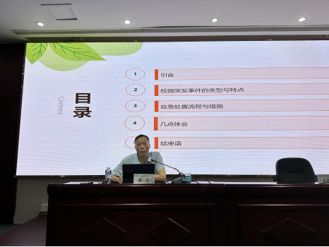 潘忠以“高校突發(fā)事件應急處置”為題,從應急處置流程與關鍵環(huán)節(jié)把控、多部門協(xié)同聯(lián)動機制建設、師生心理危機干預策略、應急預案的制定與演練優(yōu)化等四個方面展開闡述。他還結合具體校園安全事故案例,詳細闡述了校園突發(fā)事件應急處置中的注意事項,并對校園突發(fā)事件應急處置與大學生安全工作提出了意見和建議。