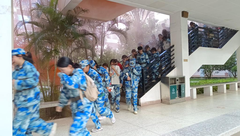 演練當(dāng)日,為了逼真還原地震、火災(zāi)場景,安全工作處在教學(xué)樓燃放了煙霧彈。隨著演練的開始,在第一聲信號發(fā)出后,同學(xué)們在輔導(dǎo)員及工作人員的帶領(lǐng)下做好了地震來臨時的應(yīng)急避險動作,在5秒鐘之后,第二聲信號響起,全體同學(xué)掩住口鼻,快速、有序地從各間教室撤離教學(xué)樓。參加本次演練的新生共計4000余人,三場演練平均用時1分45秒,演練過程順利,服從指揮,達(dá)到了預(yù)期的效果。
