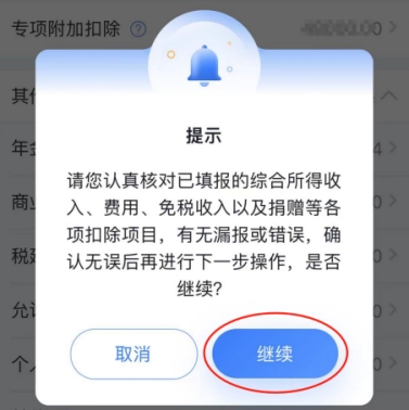 (五)以上所有數(shù)據(jù)確認(rèn)無(wú)誤后,點(diǎn)“下一步”,跳出提示窗,請(qǐng)仔細(xì)閱讀提示內(nèi)容后,點(diǎn)“繼續(xù)”,進(jìn)入稅款計(jì)算界面。