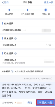 1.稅款計(jì)算后,查看應(yīng)補(bǔ)稅款,點(diǎn)擊“享受免申報(bào)”。