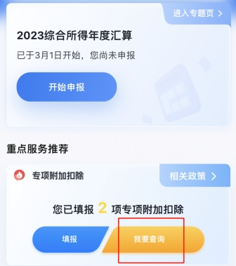 第一步:登錄“個(gè)人所得稅”APP,在“專(zhuān)項(xiàng)附加扣除”欄,點(diǎn)“我要查詢(xún)”,選擇查詢(xún)年度“2023”,核對(duì)本人2023年度專(zhuān)項(xiàng)附加填報(bào)信息。