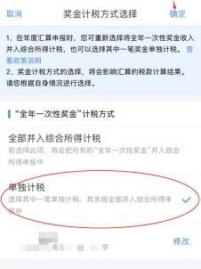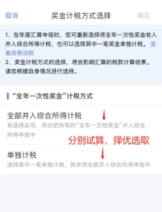 點(diǎn)擊“工資薪金”-“全年一次性獎(jiǎng)金”計(jì)稅方式有“全部并入綜合所得計(jì)稅”和“單獨(dú)計(jì)稅”兩種,可以分別試算后,返回申報(bào)頁(yè)面,選最優(yōu)方式。