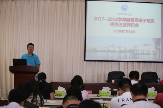 考核工作結(jié)束后,我院在六樓會議室召開領(lǐng)導(dǎo)班子成員述責(zé)述廉會議。領(lǐng)導(dǎo)班子成員逐個對一學(xué)年來履行工作職責(zé)和遵守紀(jì)律的情況做了簡要匯報,與會人員對學(xué)院黨委領(lǐng)導(dǎo)班子成員述責(zé)述廉進行了民主評議。