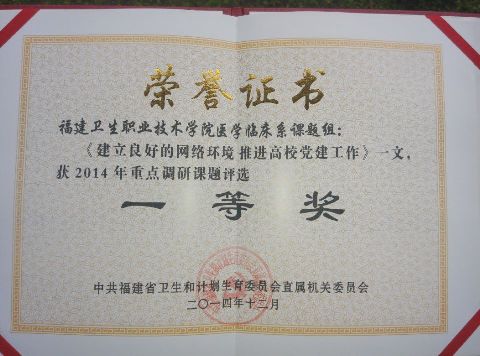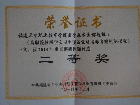近日,福建省衛(wèi)生和計劃生育委員會直屬機關(guān)委員會下發(fā)了《關(guān)于表彰2014年重點課題調(diào)研獲獎?wù)撐牡耐▓蟆罚ㄩ}衛(wèi)委直黨〔2014〕39號),學院醫(yī)學基礎(chǔ)部臨床醫(yī)學系黨總支課題組調(diào)研成果《建立良好的網(wǎng)絡(luò)環(huán)境 推進高校黨建工作》和醫(yī)學技術(shù)系黨總支課題組調(diào)研成果《高職院校醫(yī)學實習生預(yù)備黨員培養(yǎng)考察機制探究》分別獲得一等獎和二等獎。