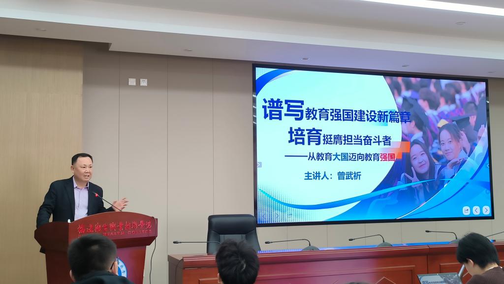 曾武祈以《譜寫教育強(qiáng)國建設(shè)新篇章 培育挺膺擔(dān)當(dāng)奮斗者——從教育大國邁向教育強(qiáng)國》為題,圍繞“堅(jiān)實(shí)基礎(chǔ) 戰(zhàn)略支撐”“蓬勃發(fā)展 優(yōu)質(zhì)均衡”“深化改革 系統(tǒng)推進(jìn)”“錨定目標(biāo) 篤行實(shí)干”四個(gè)維度系統(tǒng)闡釋了教育強(qiáng)國的戰(zhàn)略意義與實(shí)踐路徑。他強(qiáng)調(diào),建設(shè)教育強(qiáng)國是實(shí)現(xiàn)中華民族偉大復(fù)興的基礎(chǔ)工程,高校作為人才培養(yǎng)主陣地,要堅(jiān)持黨建引領(lǐng),將思政教育貫穿育人全過程,著力培養(yǎng) “政治堅(jiān)定、技術(shù)精湛、醫(yī)德高尚”的新時(shí)代醫(yī)藥衛(wèi)生人才,在扎實(shí)推進(jìn)教育強(qiáng)國的過程中,鑄牢中華民族共同體意識(shí)。