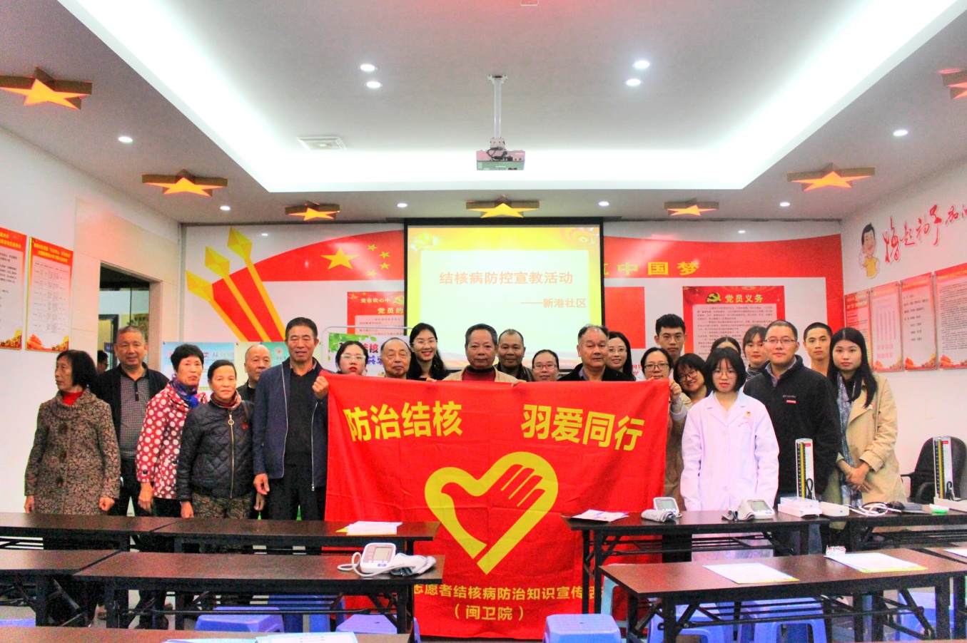 為了讓結(jié)核病防治知識(shí)家喻戶(hù)曉,提高人民群眾結(jié)核病防治知識(shí)知曉率,做到有病早醫(yī),無(wú)病早防,深入社區(qū)宣傳,動(dòng)員全社會(huì)參與和關(guān)注結(jié)核病控制工作,2019年11月28日下午,預(yù)防醫(yī)學(xué)專(zhuān)業(yè)帶頭人李宏副教授、教研室主任揭金花帶領(lǐng)專(zhuān)業(yè)教師黨員、系結(jié)核病防治宣傳志愿者團(tuán)隊(duì)成員、部分學(xué)生黨員、入黨積極分子赴馬尾區(qū)羅星街道新港社區(qū)開(kāi)展“志愿服務(wù)社區(qū)行”健康宣教活動(dòng),宣傳如何預(yù)防結(jié)核病這一傳染性疾病。