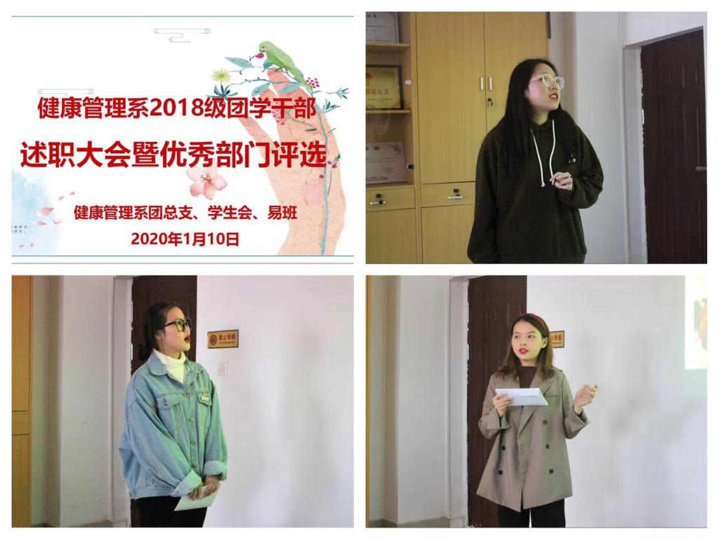 大會(huì)伊始,健康管理系團(tuán)總支、學(xué)生會(huì)各部門(mén)部長(zhǎng)與易班工作站站長(zhǎng)對(duì)2019年本崗位的履職情況進(jìn)行述職,特別是圍繞自身的工作理念、總結(jié)工作上的得失、工作中的改進(jìn)措施等方面展開(kāi)了匯報(bào)。各部門(mén)部長(zhǎng)在進(jìn)行述職過(guò)程中通過(guò)PPT、視頻等形式向大家講述本部門(mén)在這一學(xué)年的主要活動(dòng)與總結(jié),更加生動(dòng)形象地將自己部門(mén)的工作情況與下學(xué)期的工作計(jì)劃展示給在座的老師和同學(xué)。