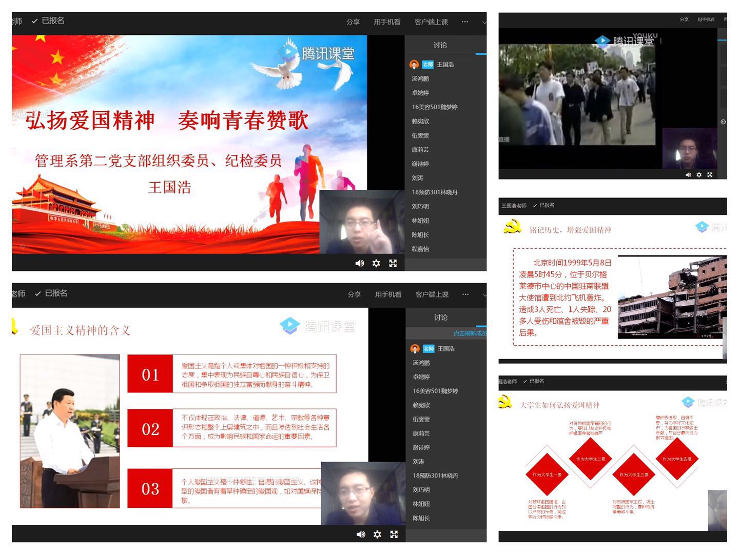 為引導(dǎo)學(xué)生進(jìn)一步牢固樹立正確的祖國觀、民族觀、文化觀、歷史觀,培育我系學(xué)生的愛國主義精神,實(shí)現(xiàn)中華民族偉大復(fù)興的中國夢(mèng)不懈奮斗。4月15日下午,第六期業(yè)余分黨校培訓(xùn)班的全體124名學(xué)員通過“騰訊會(huì)議”直播平臺(tái),聆聽了我系第二黨支部組織委員、紀(jì)檢委員王國浩老師主講的題為《弘揚(yáng)愛國主義精神,奏響青春贊歌》的線上分黨校培訓(xùn)課程。旨在通過本次黨課學(xué)習(xí),增強(qiáng)各學(xué)員對(duì)愛國主義精神的認(rèn)識(shí),堅(jiān)定當(dāng)代大學(xué)生的中國特色社會(huì)主義理想信念。