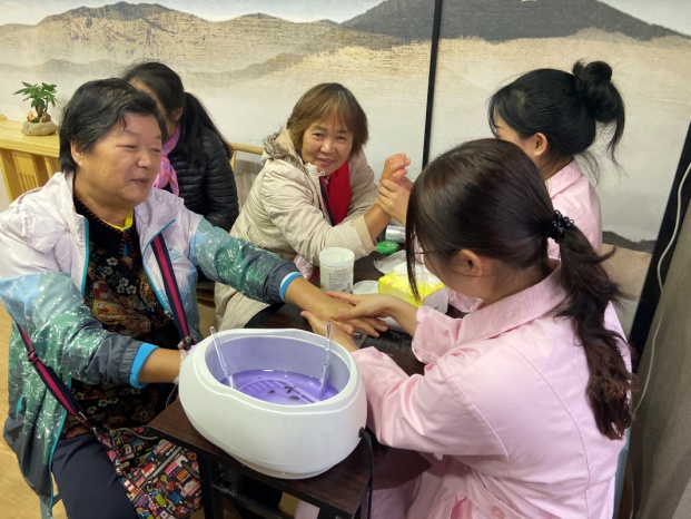 醫(yī)學美容教研室吳若云老師、施怡寧老師帶領醫(yī)學美容技術專業(yè)學生與社區(qū)居民零距離接觸,為社區(qū)的阿姨進行現(xiàn)場美甲及手部護理蠟療。參與互動的群眾對本次活動的專業(yè)度表示極大的認可,對手部護理也有了更新更科學的認識,進一步提高了美學素養(yǎng)。本次活動既增強了居民對健康美容知識和技能的了解,提高了我院醫(yī)學美容技術專業(yè)的知名度,同時也提高了學生的實踐能力。