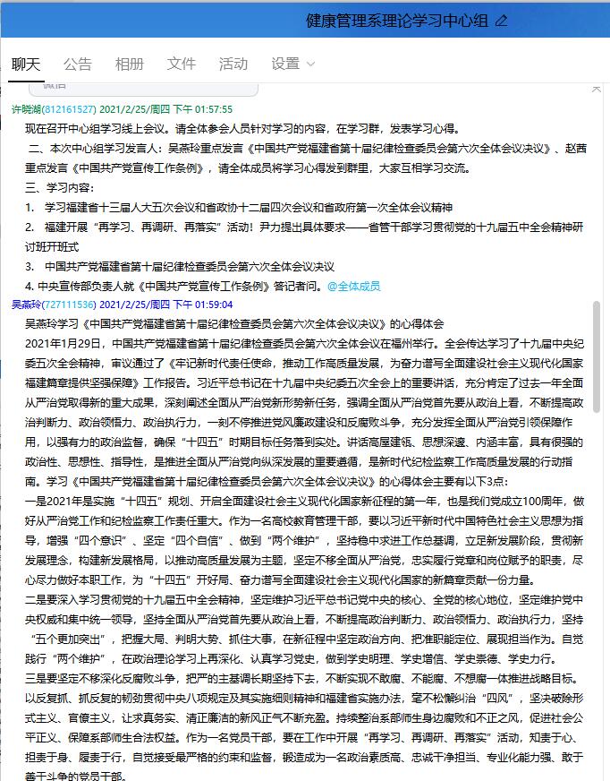 2021年2月25日,健康管理系理論學(xué)習(xí)中心組召開線上學(xué)習(xí)會(huì)議,本次中心組學(xué)習(xí)重點(diǎn)學(xué)習(xí)《中國(guó)共產(chǎn)黨福建省第十屆紀(jì)律檢查委員會(huì)第六次全體會(huì)議決議》、《中國(guó)共產(chǎn)黨宣傳工作條例》。