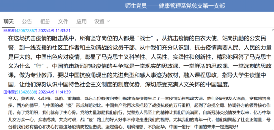 教師黨員邱多多同志表示,在這場抗擊疫情的阻擊戰(zhàn)中,所有堅守崗位的人都是“戰(zhàn)士”。從抗擊疫情的白衣天使、站崗執(zhí)勤的公安民警,到一線支援的社區(qū)工作者和主動請戰(zhàn)的黨員干部。從中我們充分認識到,抗擊疫情需要人民,人民的力量是巨大的。中國出色應(yīng)對疫情,彰顯了馬克思主義科學(xué)性、人民性、實踐性和創(chuàng)新性,精彩地回答了馬克思主義為什么“行”。做為專業(yè)教師,我要以中國抗疫涌現(xiàn)出的先進典型和感人事跡為教材,融入課程思政,指導(dǎo)大學(xué)生讀懂中國,讓他們深刻認識中國特色社會主義制度的制度優(yōu)勢,深切感受充滿人文關(guān)懷的中國溫度。