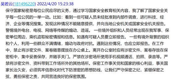學(xué)習(xí)后,教師黨員吳若云同志表示,保守國家秘密是每位公民應(yīng)盡的義務(wù),在日常生活和工作中,如果遇到可疑事件或可疑人物,如:看到一些可疑人員未經(jīng)批準(zhǔn)到內(nèi)部作調(diào)查,進(jìn)行科技、經(jīng)濟(jì)、企業(yè)等情況搜集,應(yīng)當(dāng)向當(dāng)?shù)毓矙C(jī)關(guān)或國家安全機(jī)關(guān)報(bào)告。保密工作事關(guān)黨和國家的核心利益,事關(guān)國家長治久安,必須筑牢信息化時(shí)代下防泄密的思想防線,讓我們嚴(yán)守保密之紀(jì),緊繃保密之弦,勇?lián)C苤?zé),共同營造良好的保密氛圍。
