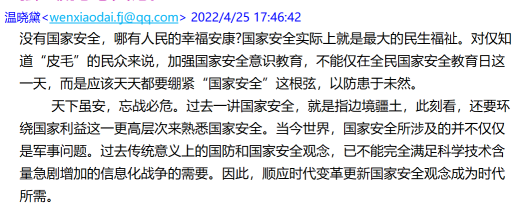 教師黨員溫曉黛同志表示,沒有國家安全,哪有人民的幸福安康?國家安全實(shí)際上就是最大的民生福祉。對僅知道“皮毛”的民眾來說,加強(qiáng)國家安全意識教育,不能僅在全民國家安全教育日這一天,而是應(yīng)該天天都要繃緊“國家安全”這根弦,以防患于未然。