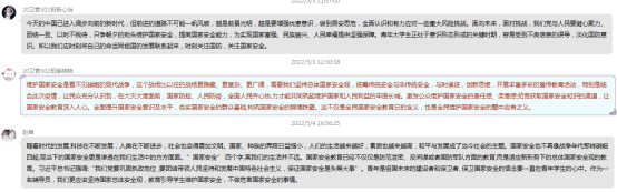 教師黨員趙茜同志表示,青年是祖國未來的建設(shè)者和保衛(wèi)者, 保衛(wèi)國家安全的信念要一直在青年學(xué)生的心中。作為一名輔導(dǎo)員,我們更應(yīng)該堅(jiān)持國家總體安全觀,教育引導(dǎo)學(xué)生維護(hù)國家安全,不做危害國家安全的事情。