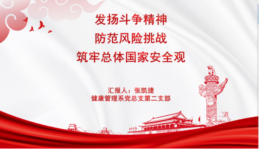 為了響應(yīng)全民國(guó)家安全教育日號(hào)召,切實(shí)提高政治站位,全面貫徹總體國(guó)家安全觀,進(jìn)一步推動(dòng)總體國(guó)家安全觀入腦入心,形成國(guó)家安全教育的良好局面。健康管理系黨總支第二支部于5月6日在學(xué)生服務(wù)中心會(huì)議室召開(kāi)“發(fā)揚(yáng)斗爭(zhēng)精神,防范風(fēng)險(xiǎn)挑戰(zhàn),筑牢總體國(guó)家安全觀”主題黨課。本次黨課由健康管理系黨總支第二支部書記張凱捷主持,支部學(xué)生黨員代表參加會(huì)議。