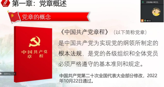 為學(xué)習(xí)貫徹習(xí)近平新時(shí)代中國特色社會主義思想,深入了解《中國共產(chǎn)黨章程》,2月2日下午,健康管理系第九期分黨校青馬培訓(xùn)班第二課:學(xué)習(xí)中國共產(chǎn)黨章程,全體成員于通過線上舉行,健康管理系團(tuán)總支副書記李江江主講。