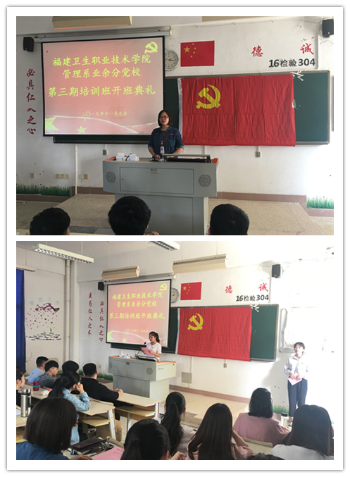 11月9日下午,管理系在教學(xué)樓314教隆重舉行第三期業(yè)余分黨校培訓(xùn)班開班典禮。管理系黨總支副書記艾松軍,黨總支紀(jì)檢委員陳盛蘭,黨總支組織委員、學(xué)生黨支部書記揭金花,教工黨支部書記、團(tuán)總支書記邱麟,學(xué)生黨支部組織委員李丹,團(tuán)總支副書記馮瑞華,輔導(dǎo)員詹燕婷以及系團(tuán)學(xué)干部、入黨積極分子及部分先進(jìn)分子參加了開班典禮。