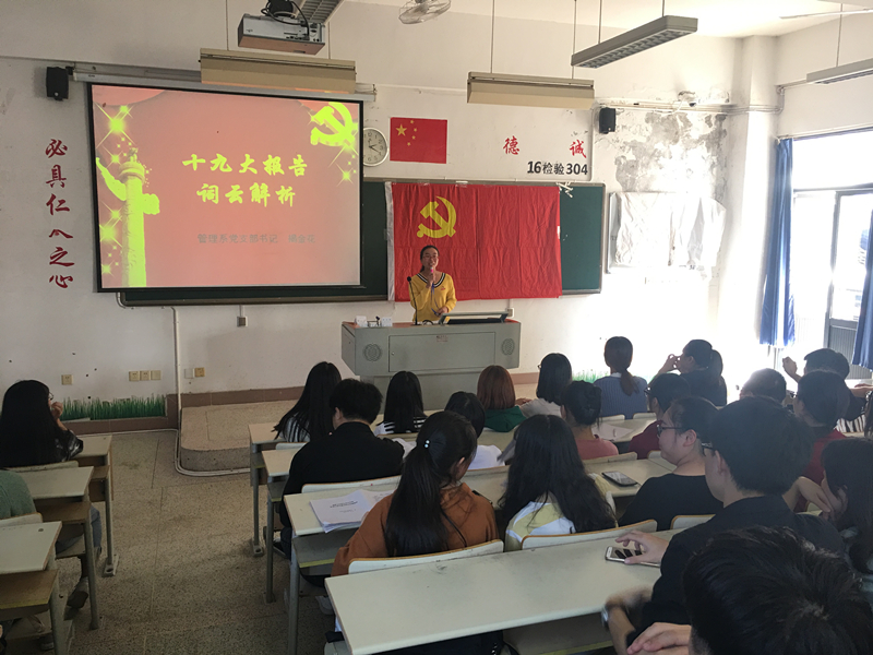 11月9日下午,黨總支組織委員、學生黨支部書記揭金花在教學樓314教為管理系第三期業(yè)余分黨校學員們講授了題為《十九大詞云解析》的第一課。