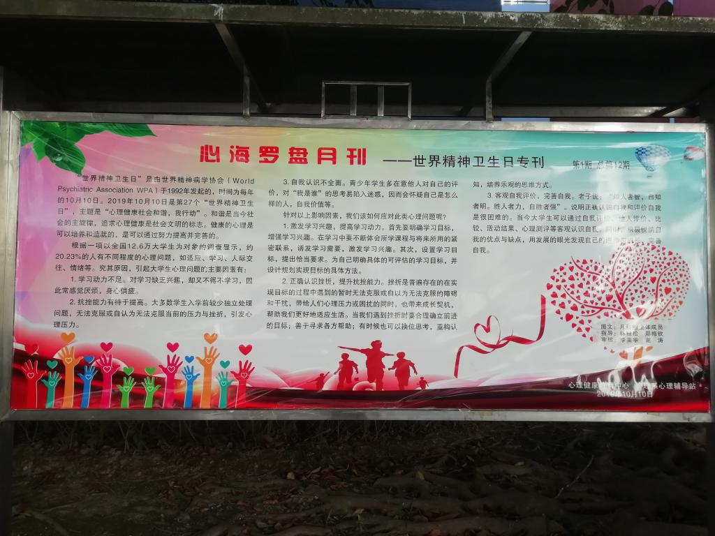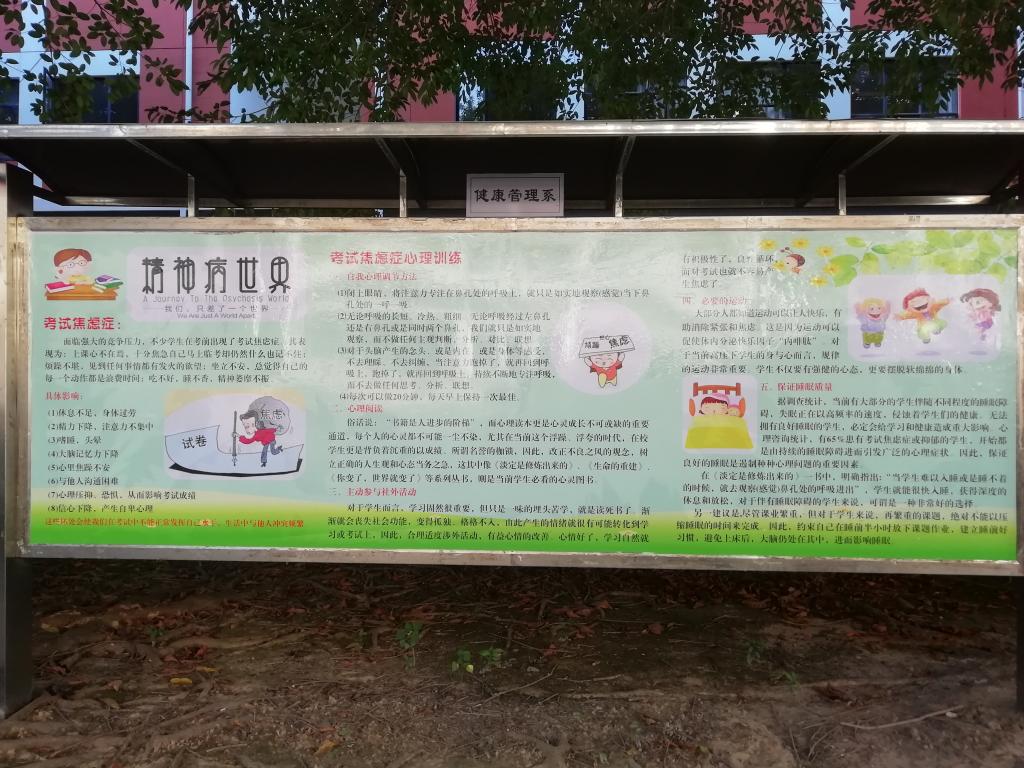 心理健康教育中心以及各系部都出一期宣傳欄和橫幅,旨在大力普及和宣傳第28個(gè)“世界精神衛(wèi)生日”的主題。各系部在院心理中心的帶領(lǐng)下,群策群力,積極認(rèn)真,無論是宣傳欄還是橫幅標(biāo)語,內(nèi)容緊扣主題,結(jié)合大學(xué)生個(gè)性以及日常學(xué)習(xí)生活中常遇見的問題,表達(dá)通俗易懂,生動(dòng)活潑,畫面多彩清新,深受學(xué)生歡迎喜愛,也達(dá)到了借第28個(gè)“世界精神衛(wèi)生日”,在全院制造重視精神衛(wèi)生、心理衛(wèi)生的濃厚氛圍的效果。