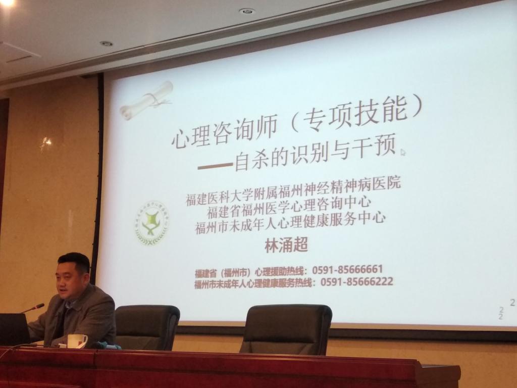 12月31日(周二)14:30分,心理健康教育中心第四輪心理健康教育培訓(xùn)如期在實(shí)訓(xùn)樓報(bào)告廳舉行。培訓(xùn)對(duì)象仍然是心理健康教育中心成員、各系心理輔導(dǎo)員、專職輔導(dǎo)員、19級(jí)兼職輔導(dǎo)員以及各班心理委員。此次講課心理專家為福州市神經(jīng)病防治院醫(yī)學(xué)心理咨詢中心主任、福州市未成年人心理健康服務(wù)中心主任、福建醫(yī)科大學(xué)應(yīng)用心理學(xué)系兼職副教授、中國心身醫(yī)學(xué)學(xué)院講師團(tuán)專家、副主任醫(yī)師林涌超。