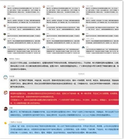 管理系第二黨支部書記馮瑞華表示經(jīng)過近2個月同心戰(zhàn)疫,我黨始終堅守初心,不忘承諾,努力克服新冠肺炎疫情影響,以更大的決心和更強的力度推進脫貧攻堅。廣大青年在防疫中用行動彰顯了青春的蓬勃力量,他們交出了合格的答卷,是好樣的,是堪當(dāng)大任的新時代中國青年。張凱捷老師表示作為一名輔導(dǎo)員,應(yīng)勸勉同學(xué)們要珍惜學(xué)習(xí)時光,磨練過硬本領(lǐng),把自己的發(fā)展同國家和民族的前途命運緊緊聯(lián)系在一起。