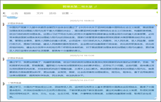 5月16日,管理系第二黨支部借助學(xué)習(xí)強(qiáng)國(guó)平臺(tái)學(xué)習(xí)了十九屆四中全會(huì)精神—中國(guó)制度十三講中的第四講:堅(jiān)持和完善中國(guó)特色社會(huì)主義行政體制,構(gòu)建職責(zé)明確、依法行政的政府治理體系。
