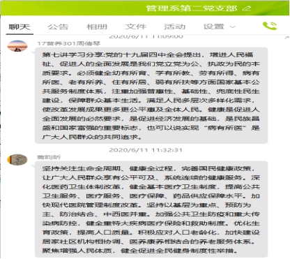6月11日,管理系第二黨支部借助學習強國平臺學習了十九屆四中全會精神——中國制度十三講中的第七講:堅持和完善統(tǒng)籌城鄉(xiāng)的民生保障制度,滿足人民日益增長的美好生活需要。黨的十九屆四中全會提出,必須健全幼有所育、學有所教、勞有所得、病有所醫(yī)、老有所養(yǎng)、住有所居、弱有所扶等方面國家基本公共服務(wù)制度體系,注重加強普惠性、基礎(chǔ)性、兜底性民生建設(shè),保障群眾基本生活,滿足人民多層次多樣化需求,使改革發(fā)展成果更多更公平惠及全體人民。