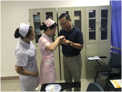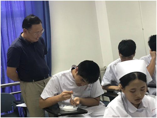 本次授課內容為護理專業(yè)《藥液抽吸技術》的示教與練習,聽課過程中,曾書記認真記錄,細心觀察學生學習狀態(tài),與學生共同學習,對教師的教學內容、教學方法、課堂管理等情況進行全面了解,課后與授課老師、學生交流授課內容、教學方法及學情等。