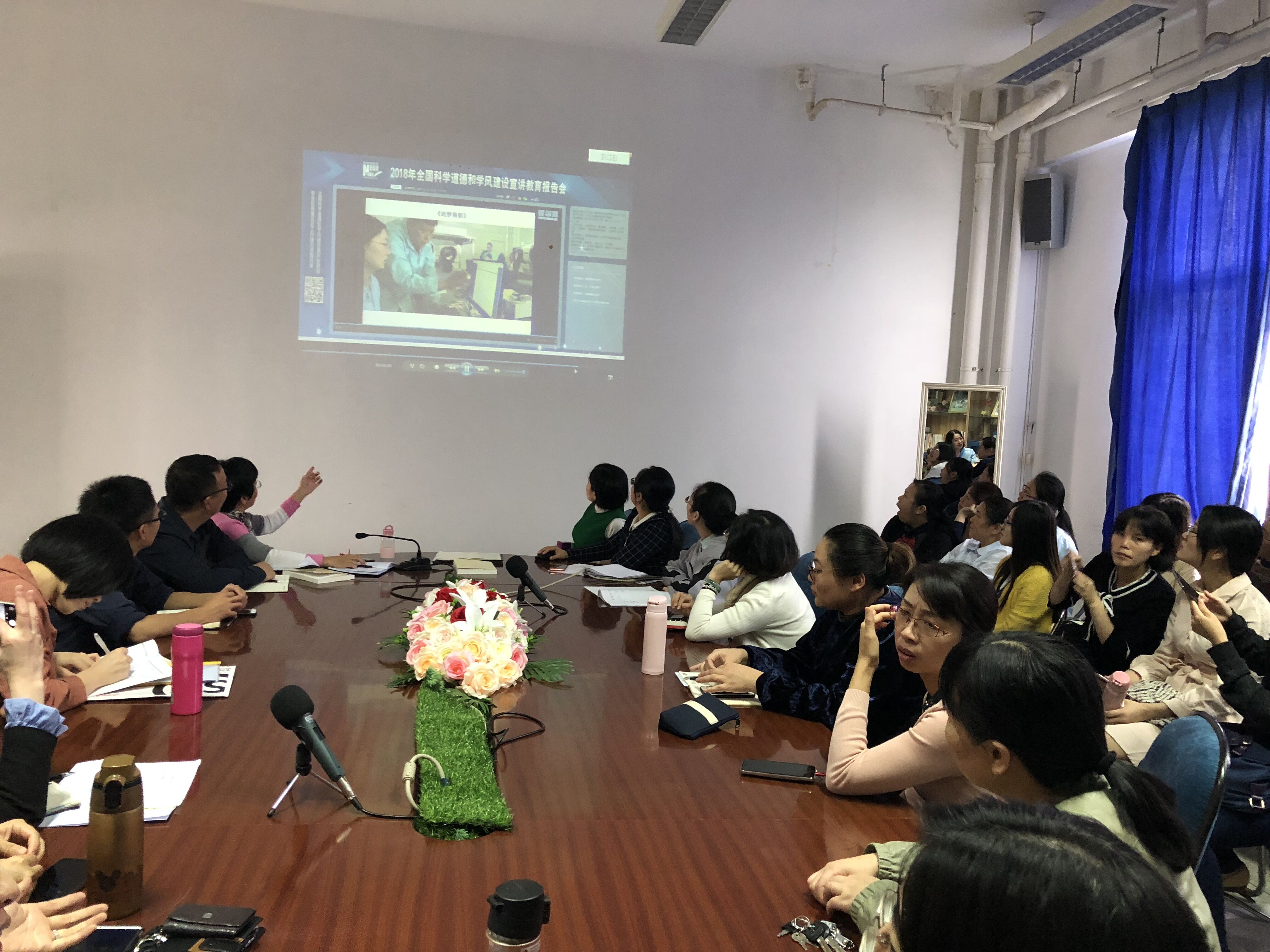 2018年10月18日中午,護理系組織全體教職員工,集中觀看了于10月15日在人民大會堂舉行的“2018年全國科學道德和學風建設宣講教育報告會”視頻錄像。
