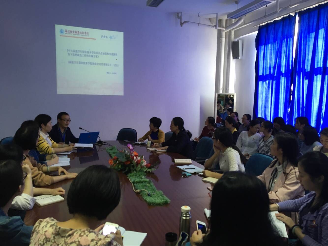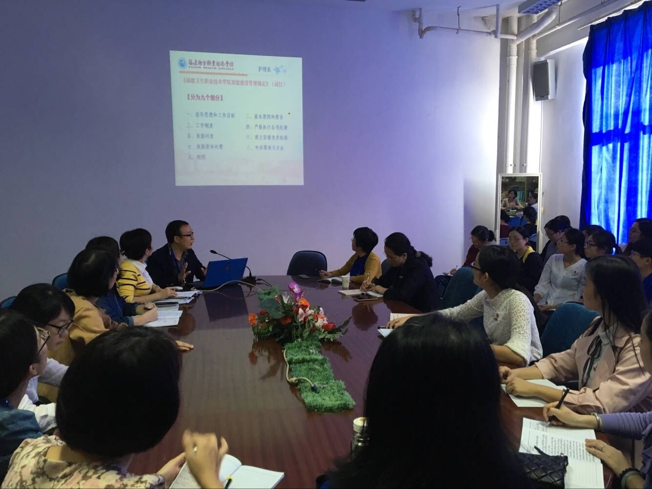 2017 年11月9日,護(hù)理系在會(huì)議室召開系部大會(huì),學(xué)習(xí)了《中共福建衛(wèi)生職業(yè)技術(shù)學(xué)院委員會(huì)加強(qiáng)和改進(jìn)新形勢下思想政治工作的實(shí)施方案》和《福建衛(wèi)生職業(yè)技術(shù)學(xué)院效能建設(shè)管理規(guī)定》(試行),全體教職工及部分學(xué)生代表參加學(xué)習(xí)。