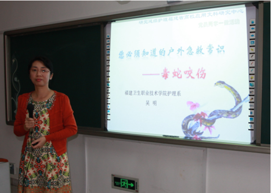 20161013日上午,在護(hù)理系黨總支的安排下,護(hù)理系第二黨支部書記吳明老師前往福建省女子監(jiān)獄舉辦一場關(guān)于蛇咬傷急救與處理的公益講座。有一百多名的女監(jiān)服刑人員和女監(jiān)醫(yī)護(hù)人員參加了此次講座。