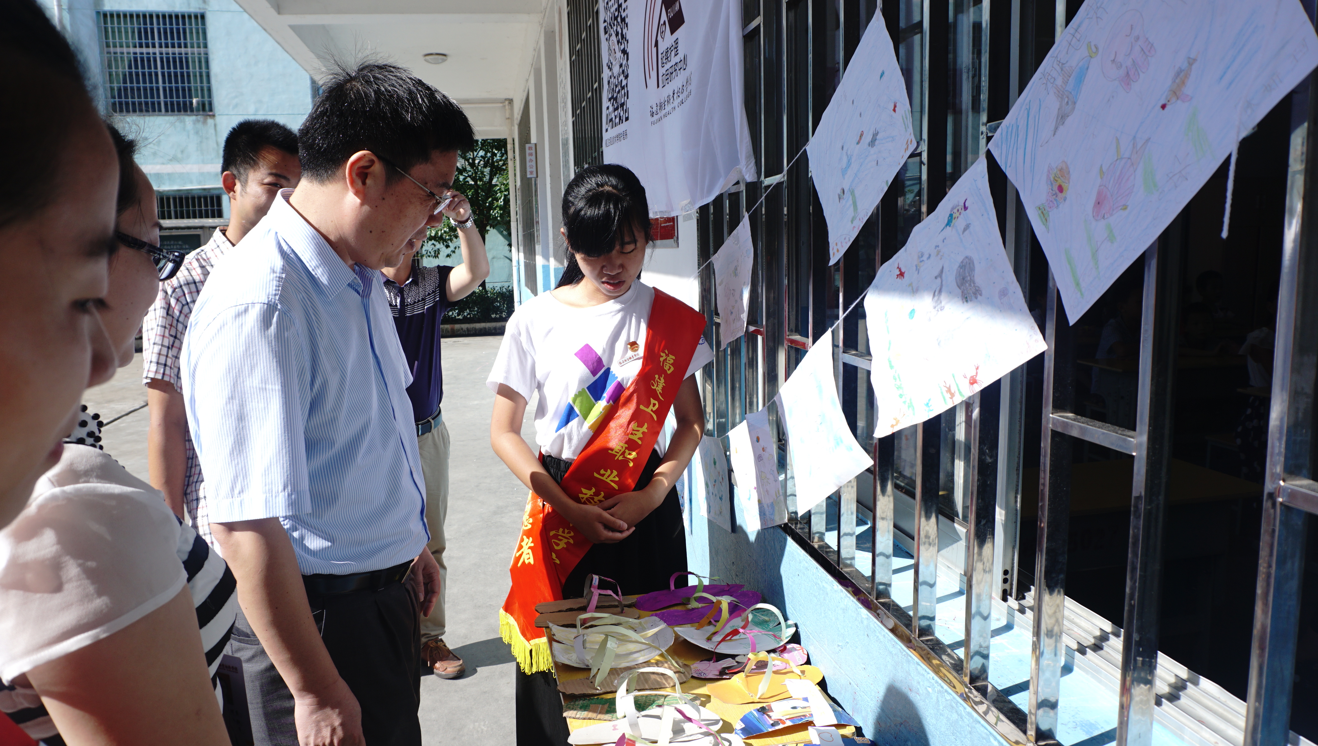 隨后林書記一行人參觀支教的課堂情況??吹街Ы痰耐瑢W(xué)們認(rèn)真地向小朋友傳播科學(xué)清理口腔衛(wèi)生的知識(shí)、狂犬病的防治、教小朋友英語露出了滿意的笑容。當(dāng)他們看到我們支教隊(duì)伍在短短的三天時(shí)間里,已經(jīng)教會(huì)小朋友制作“愛的勛章”來表達(dá)對(duì)自己所愛人的感恩;根據(jù)自己的喜愛繪畫出心中的海底世界和石頭彩繪,與他人分享自己的內(nèi)心世界;為親人繪制交通安全標(biāo)志,提醒親人出行注意安全;為了讓爸爸媽媽一回家就能感受到家的溫馨,學(xué)會(huì)了中國傳統(tǒng)的剪紙;此外,還學(xué)會(huì)制作簡易拖鞋給家人穿……各領(lǐng)導(dǎo)對(duì)此給予了高度肯定,并鼓勵(lì)學(xué)生珍惜此次鍛煉機(jī)會(huì),多與當(dāng)?shù)乩蠋?、學(xué)生溝通,多從實(shí)踐中學(xué)習(xí)知識(shí),主動(dòng)結(jié)合所學(xué)的專業(yè)知識(shí),努力幫助學(xué)生解決現(xiàn)實(shí)問題,在社會(huì)實(shí)踐的大課堂上受教育、長才干。