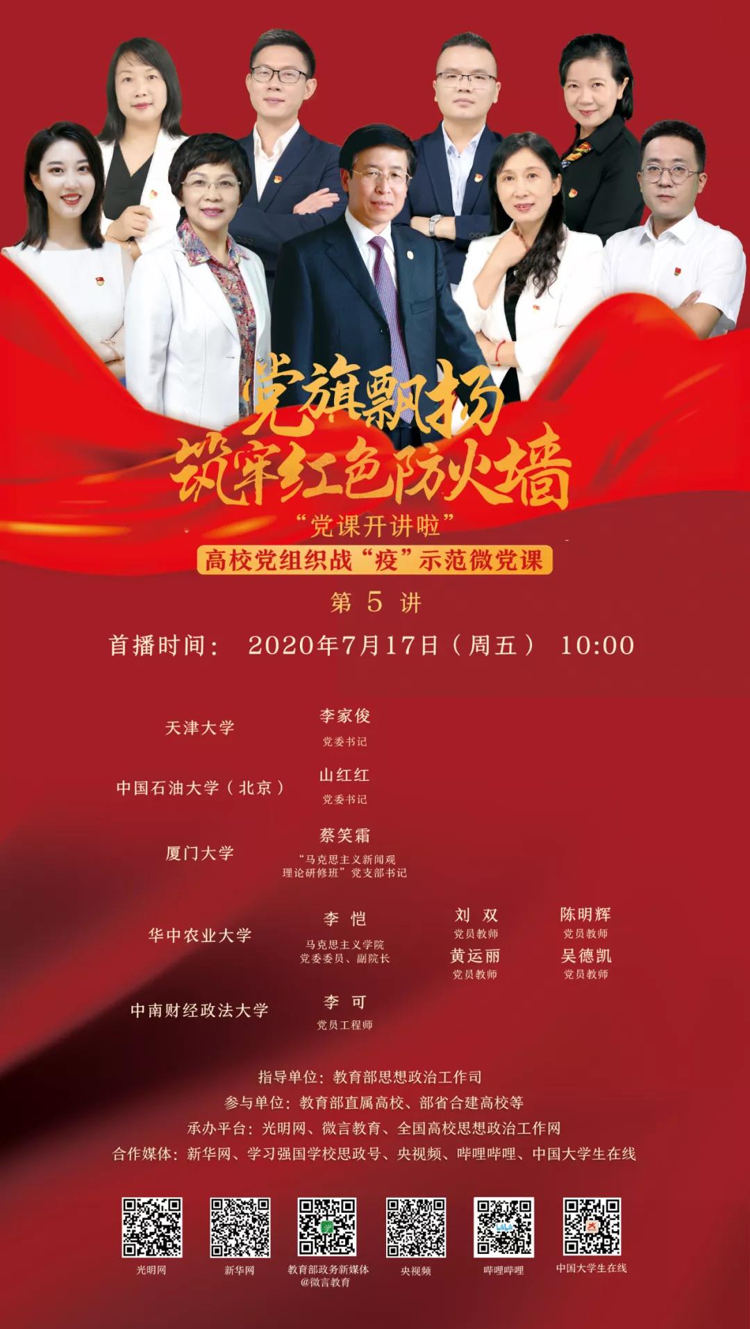 本次微黨課由天津大學、中國石油大學(北京)、廈門大學、華中農(nóng)業(yè)大學以及中南財經(jīng)政法大學的9位黨員教師講述了師生在抗疫過程中的不懈努力與擔當。他們以各種主題帶領我們認識抗“疫”過程中的先進人物,分享其中的感人事跡,引領廣大青年養(yǎng)成樂于奉獻、勇于擔當?shù)臅r代精神。