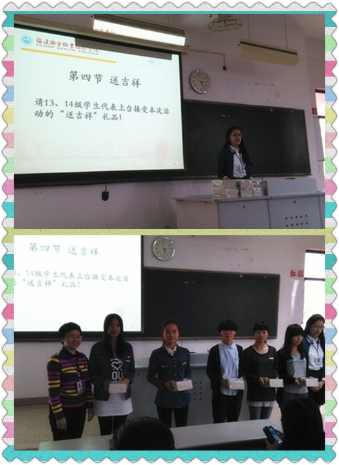本次活動主要分為兩個環(huán)節(jié)。第一環(huán)節(jié)于10月30日晚6:30在學(xué)術(shù)廳聘請福建農(nóng)林大學(xué)馬克思主義學(xué)院副書記、副院長劉新玲教授進行《公共生活中的道德》講座;第二環(huán)節(jié)分以歌唱《公民道德歌》、朗讀《公民道德三字經(jīng)》、談聆聽講座的感悟、送吉祥(發(fā)放小禮品)、行善舉(請同學(xué)們課后在校園里行一個善舉)這五個環(huán)節(jié)來進行。
