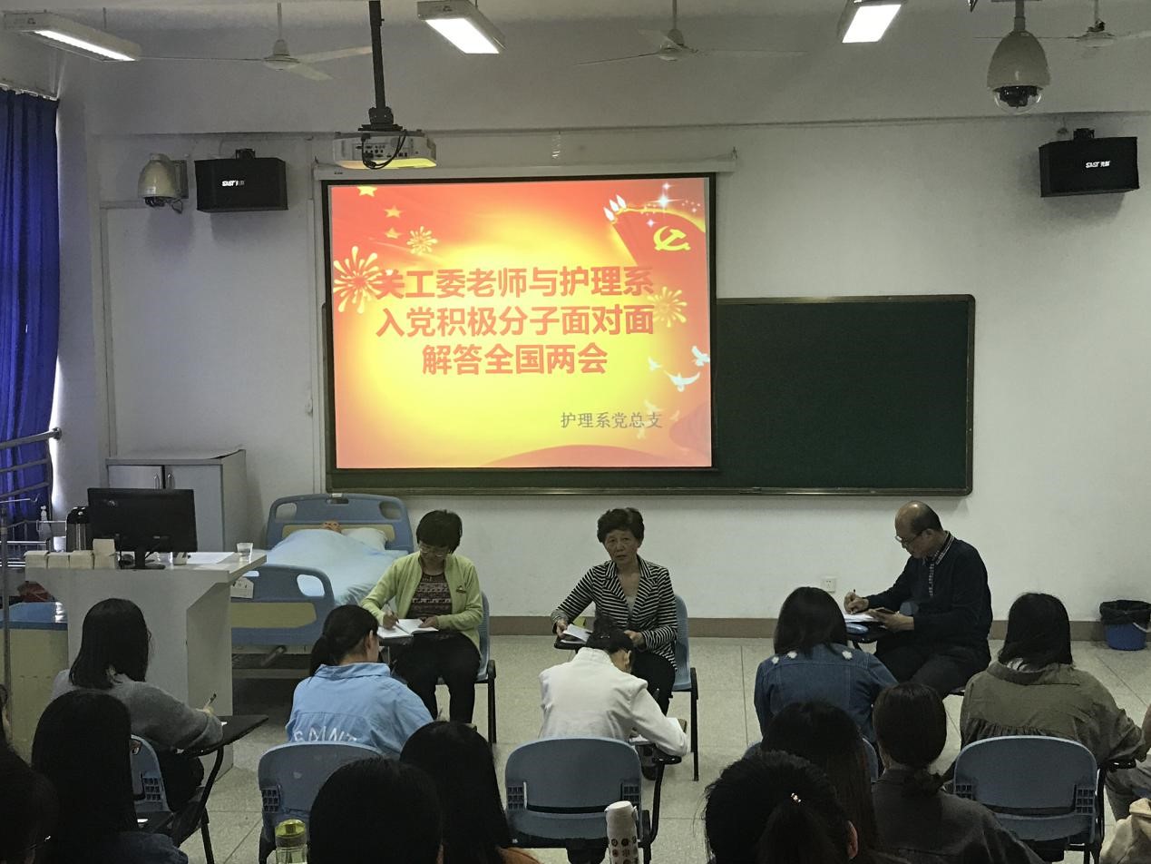 嚴(yán)肅書記從憲法的修改、關(guān)于選舉任命習(xí)近平總書記為國(guó)家主席的宣誓、關(guān)于制定黨的監(jiān)察法與國(guó)際監(jiān)察的有機(jī)結(jié)合、國(guó)務(wù)院機(jī)構(gòu)改革、政府工作報(bào)告五個(gè)方面向護(hù)理系入黨積極分子解讀兩會(huì)。陳雄副主任通過(guò)自身經(jīng)歷以及現(xiàn)代社會(huì)經(jīng)濟(jì)發(fā)展向入黨積極分子共談兩會(huì)。與會(huì)入黨積極分子針對(duì)兩會(huì)提出一系列問(wèn)題,如編制內(nèi)外的差別、醫(yī)患關(guān)系、三醫(yī)結(jié)合、養(yǎng)老制度等。嚴(yán)肅主任和陳雄副主任耐心一一解答,并期望與會(huì)入黨積極分子學(xué)好專業(yè)知識(shí),做到知行合一。呼吁入黨積極分子永遠(yuǎn)跟黨走,不忘初心,牢記使命,堅(jiān)定理想信念,積極投身于偉大的護(hù)理工作之中,為實(shí)現(xiàn)中華民族偉大復(fù)興的中國(guó)夢(mèng)不懈奮斗。