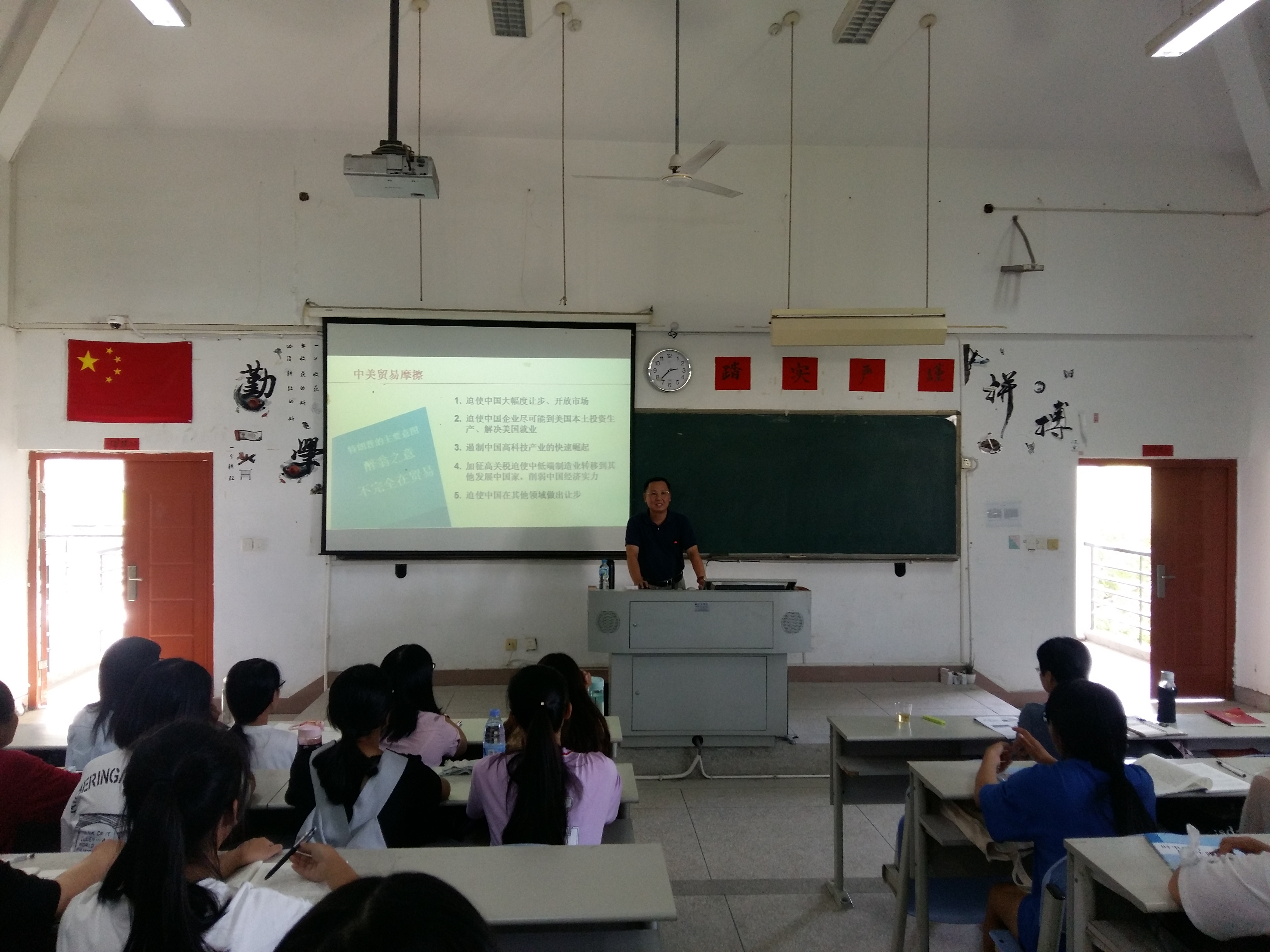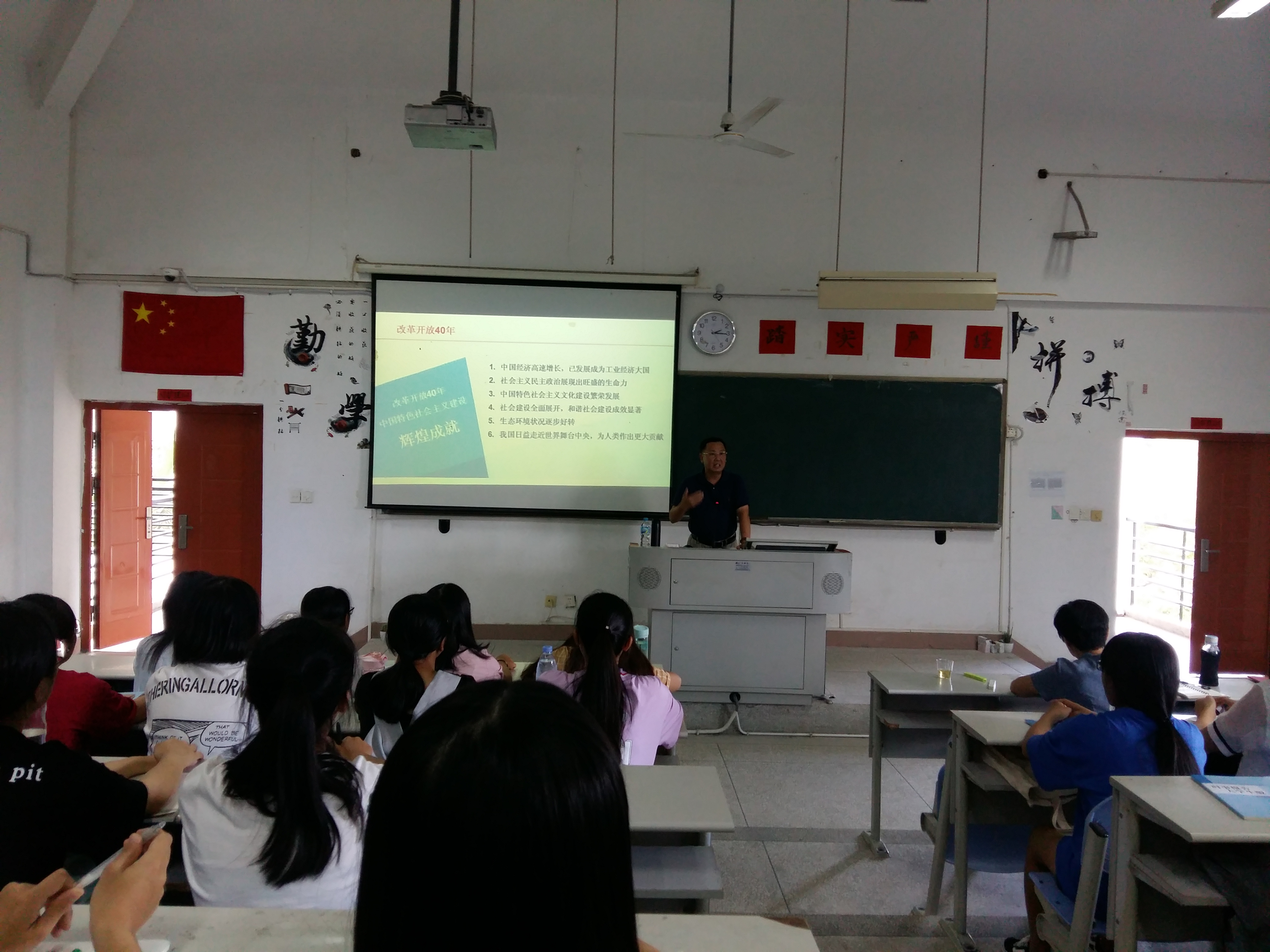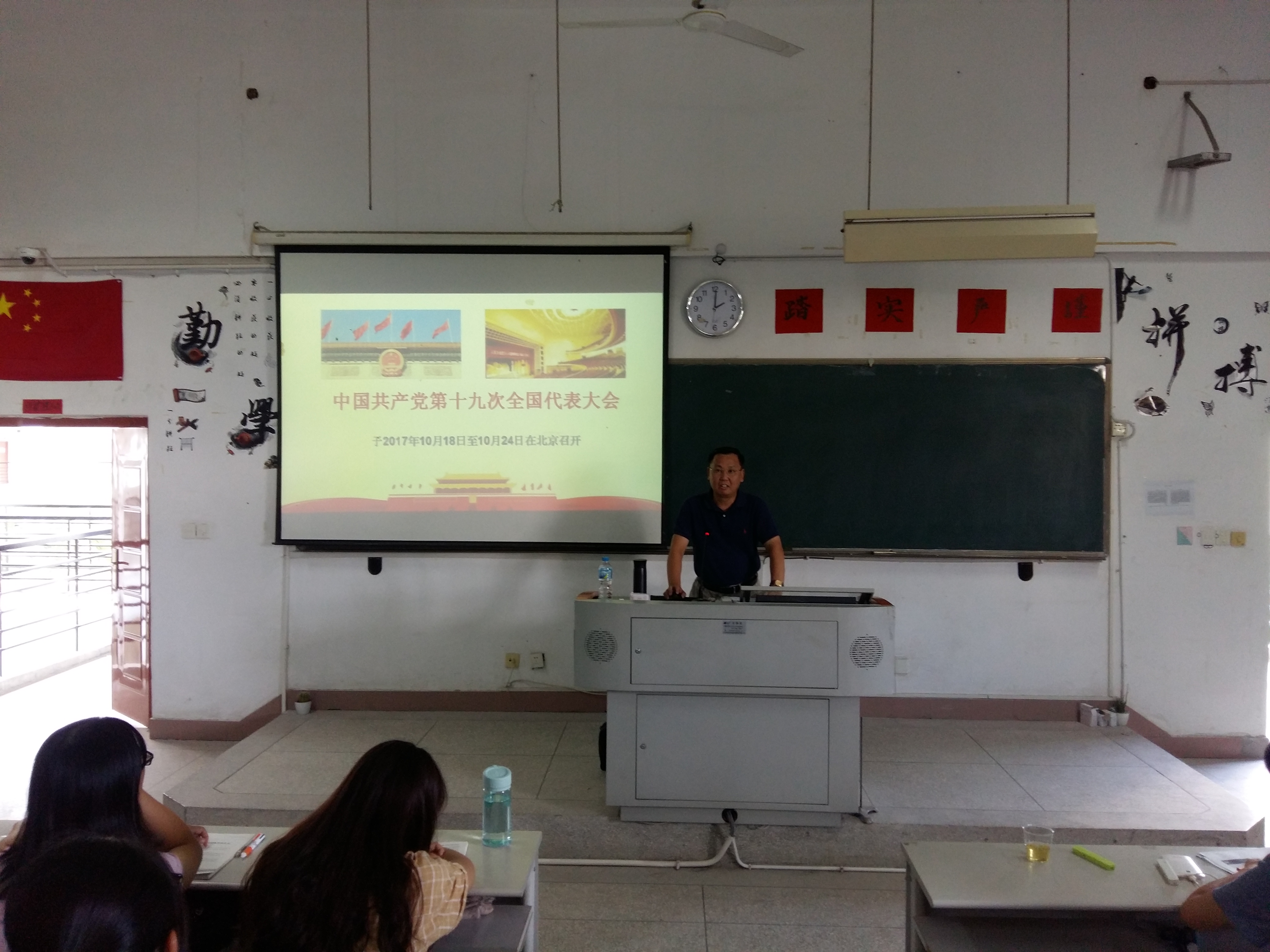 曾武祈書記從“新思想:習(xí)近平新時代中國特色社會主義思想”、“新時代:我國發(fā)展歷史新方位”、“新使命:接力奮斗擔當民族復(fù)興重任”3個方面對本次形勢與政策課內(nèi)容進行了深入淺出的講解。他通過8個明確和14個基本方略,為同學(xué)們闡明了習(xí)近平新時代中國特色社會主義思想的內(nèi)涵實質(zhì);通過高鐵、大飛機及自身不同時期出國的所見所聞,讓同學(xué)們切實感受到了祖國的發(fā)展以及新時代的涵義;通過闡釋中美、中歐、中俄、中日、中印等國家之間的關(guān)系,為同學(xué)們剖析了未來幾年大國之間的關(guān)系。最后,曾武祈書記從十九大報告提出的“教育強國”和“健康中國”戰(zhàn)略出發(fā),結(jié)合同學(xué)們自身實際,寄語同學(xué)們:要認清歷史機遇,勇?lián)鷷r代擔當。同時,他叮囑同學(xué)們要珍惜大學(xué)時光,做到勤學(xué)、修德、明辨、篤實,用青春來奮斗。