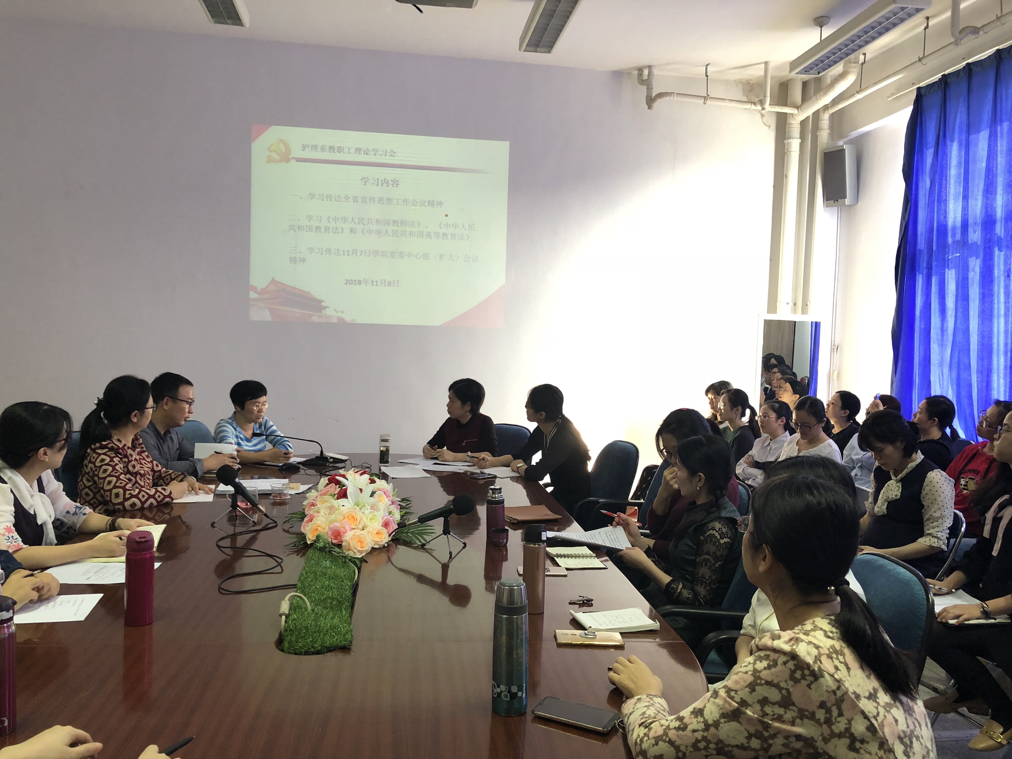 首先,謝濤書記傳達(dá)學(xué)習(xí)了全省宣傳思想工作會(huì)議精神、省委常委周聯(lián)清10月30日在宣講全國(guó)教育大會(huì)精神座談會(huì)上的講話精神以及蘇友新院長(zhǎng)在11月7日的黨委理論學(xué)習(xí)中心組(擴(kuò)大)會(huì)議上的部署要求。其次大家對(duì)學(xué)習(xí)《中華人民共和國(guó)教師法》、 《中華人民共和國(guó)教育法》和《中華人民共和國(guó)高等教育法》等情況展開了熱烈談?wù)?,大家紛紛表示要加?qiáng)習(xí)近平新時(shí)代中國(guó)特色社會(huì)主義思想、黨的十九大精神和教育相關(guān)的法律法規(guī)的學(xué)習(xí),不斷增強(qiáng)法治意識(shí)和提高政治素養(yǎng)和業(yè)務(wù)能力,為培養(yǎng)德智體美勞全面發(fā)展的社會(huì)主義建設(shè)者和接班人而奮斗。