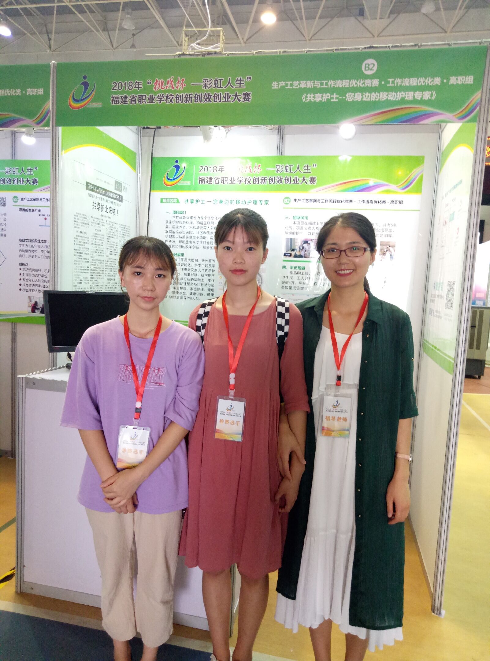 6月8日至9日,在泉州市舉辦2018年福建省職業(yè)學校“挑戰(zhàn)杯——彩虹人生”創(chuàng)新創(chuàng)業(yè)大賽,我系創(chuàng)新創(chuàng)業(yè)項目《共享護士——您身邊的移動護理專家》榮獲高職組特等獎,項目負責人16級護理專業(yè)許燕玲,項目成員有17級護理專業(yè)連婉純和17級助產(chǎn)專業(yè)陳靜怡,項目指導老師為管理系李其鏗老師和我系吳婷婷老師。