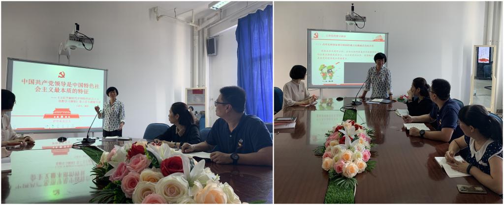 課上,謝濤書記就《習(xí)近平新時(shí)代中國(guó)特色社會(huì)主義思想學(xué)習(xí)綱要》第六章內(nèi)容——中國(guó)共產(chǎn)黨領(lǐng)導(dǎo)是中國(guó)特色社會(huì)主義最本質(zhì)的特征與大家做了分享。她強(qiáng)調(diào),習(xí)近平總書記在黨的十九大報(bào)告中說(shuō)道,“黨政軍民學(xué),東西南北中,黨是領(lǐng)導(dǎo)一切的”,這充分說(shuō)明了我們要把黨的領(lǐng)導(dǎo)落實(shí)到一切工作當(dāng)中去。接著,她從堅(jiān)決做到“兩個(gè)維護(hù)”、完善堅(jiān)持黨的領(lǐng)導(dǎo)的體制機(jī)制、全面增強(qiáng)黨的執(zhí)政本領(lǐng)三個(gè)方面向我們解讀了為什么說(shuō)中國(guó)共產(chǎn)黨領(lǐng)導(dǎo)是中國(guó)特色社會(huì)主義最本質(zhì)的特征。最后,她強(qiáng)調(diào),中國(guó)共產(chǎn)黨領(lǐng)導(dǎo)是中國(guó)特色社會(huì)主義最本質(zhì)的特征,澄明了中國(guó)特色社會(huì)主義與中國(guó)共產(chǎn)黨的根本性聯(lián)系,也必將推動(dòng)中國(guó)特色社會(huì)主義和中國(guó)共產(chǎn)黨自身的發(fā)展和完善。