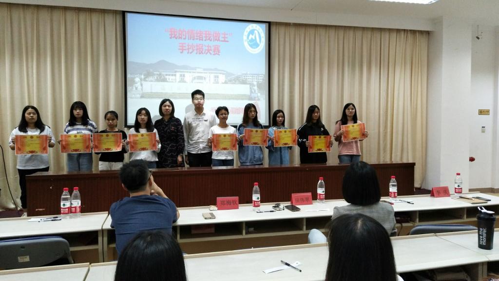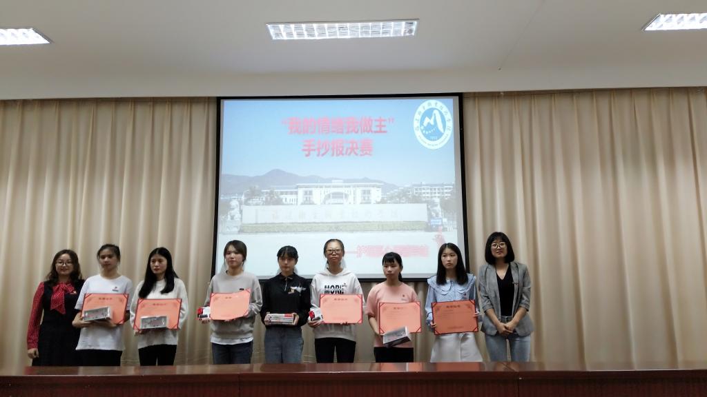 決賽于2019年10月20日在行政樓六樓會議室進(jìn)行。參與此次活動的有院心理健康教育中心副主任田偉翠老師、護(hù)理系心理輔導(dǎo)站鄭梅欽老師、護(hù)理系團(tuán)總支副書記張龍、林飛準(zhǔn)老師、護(hù)理系輔導(dǎo)員李曉佳等老師,以及全體心理委員和部分同學(xué)?;顒又羞x手們主要借用PPT分享自己優(yōu)秀的手抄報(bào)作品、創(chuàng)作思路與內(nèi)心感悟。在體驗(yàn)兩個小時的“情緒調(diào)控術(shù)”盛宴后,評委老師們根據(jù)選手們的綜合表現(xiàn)得出:謝琳潔獲得一等獎,徐琳馨等3人獲得二等獎,付詩藝、陳虹等4人獲得三等獎,呂金蓮、江舒敏,郭凌湘等人獲得優(yōu)秀獎。