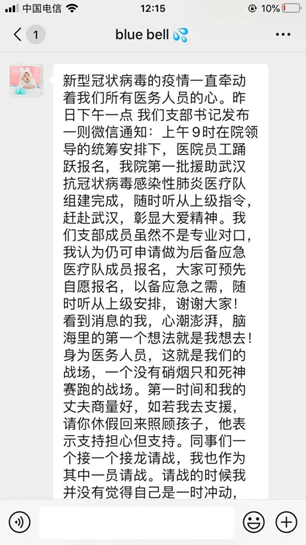 她說:一方有難,八方支援,身為一個醫(yī)務(wù)人員的我,愿意沖在最前線,砥礪前行,武漢加油!我們與你同在!