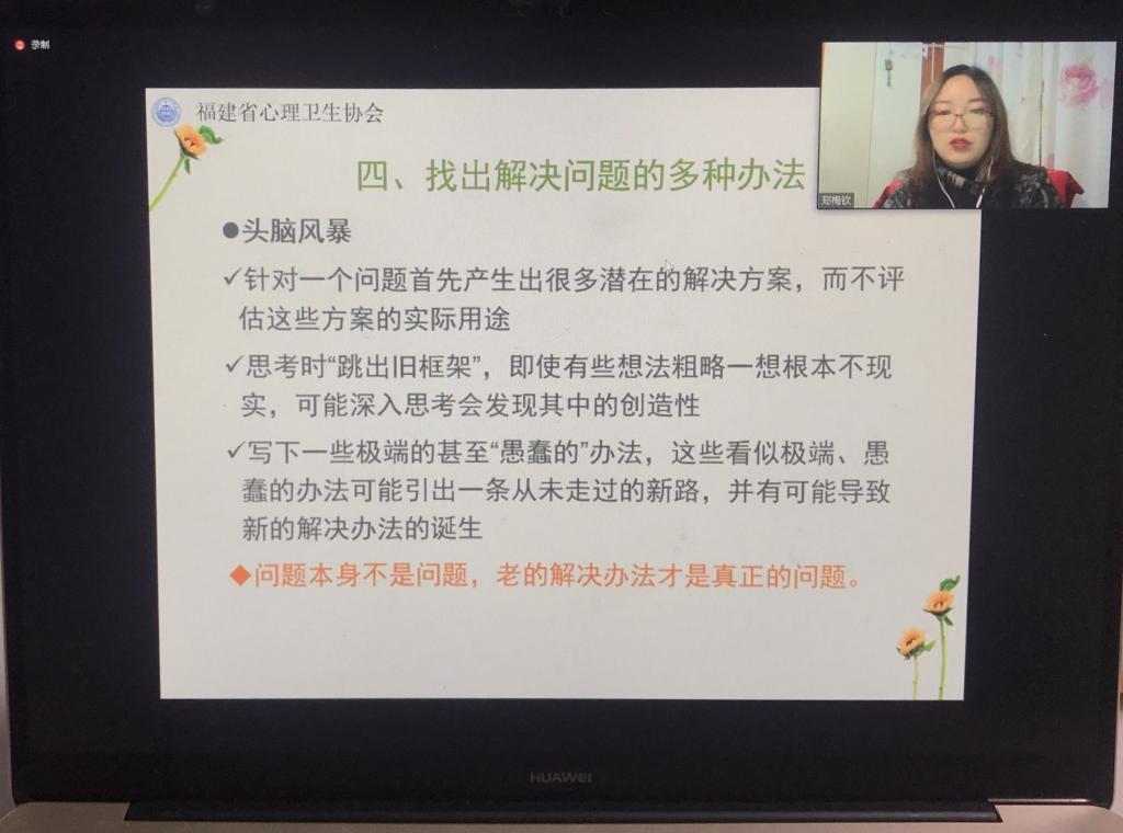 2020年2月19日晚,護理系二級心理輔導站站長、國家二級心理咨詢師、心理治療師鄭梅欽老師受邀為閩政通福建省新冠肺炎心理援助平臺受訓志愿者開展專業(yè)講座——《問題解決治療在熱線中的運用》,百余名行業(yè)學員參加此次講座。
