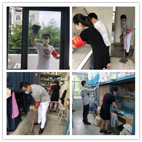 開窗通風(fēng)透氣,細心整理歸置物品,打包易濕易霉東西、收拾衣服、整理被子、擺齊桌椅、擦拭床架柜子、清潔窗戶、掃地拖地、清掃垃圾...... 在學(xué)生宿舍,老師們不畏臟,不怕累,擼起袖子干得熱火朝天。大家分工合作,默契配合,認真清理宿舍的每一個角落。并安排工作人員對宿舍進行全面消殺,為學(xué)生打造安全、衛(wèi)生的宿舍環(huán)境。