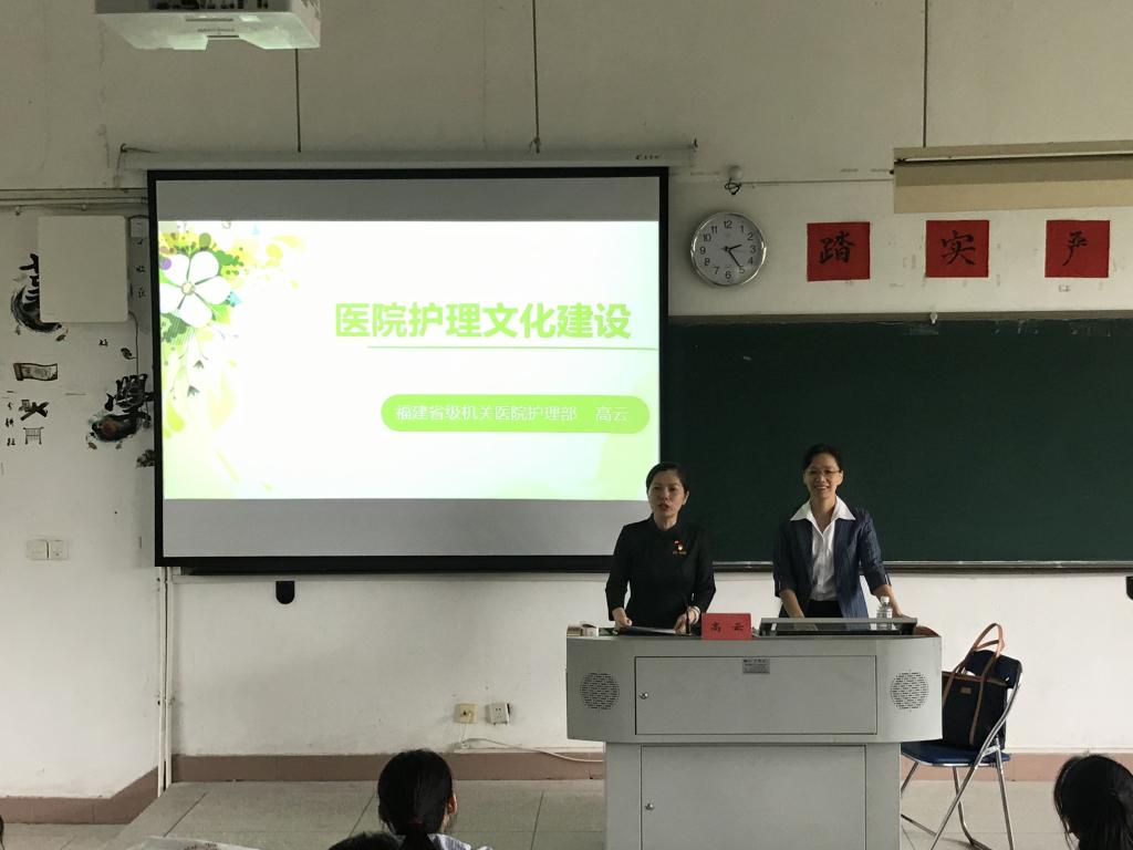 自《白衣天使文化融入護(hù)生思想政治教育的實(shí)踐探索》項(xiàng)目獲批到實(shí)施開展已歷兩年有余,在這過程中,我們以白衣天使文化為統(tǒng)領(lǐng),緊鑼密鼓的開展了形式多樣、內(nèi)容豐富的校園活動,根據(jù)項(xiàng)目前期計(jì)劃,特邀請福建省直機(jī)關(guān)醫(yī)院護(hù)理部主任兼院感科科長、福建省護(hù)理學(xué)會第八屆理事會理事——高云主任,于10月15日為我系學(xué)生做《醫(yī)院護(hù)理文化建設(shè)》的講座。
