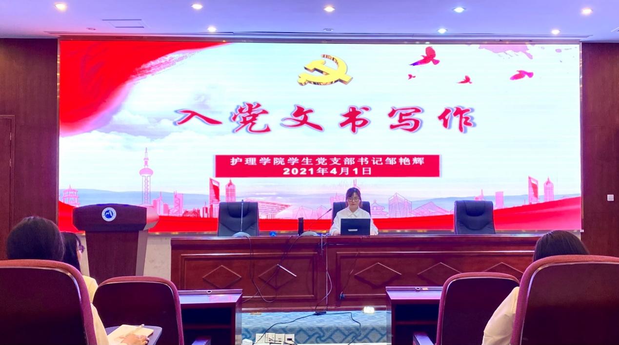 為進(jìn)一步提高入黨積極分子的進(jìn)一步提高政治素質(zhì)和理論素養(yǎng),規(guī)范同學(xué)們?nèi)朦h文書(shū)寫(xiě)作, 2021年4月1日,福建衛(wèi)生職業(yè)技術(shù)學(xué)院護(hù)理學(xué)院分黨校培訓(xùn)班第二次課程于實(shí)訓(xùn)樓四樓會(huì)議廳順利舉行,由護(hù)理學(xué)院學(xué)生黨支部書(shū)記鄒艷輝為入黨積極分子主講《入黨文書(shū)寫(xiě)作》。