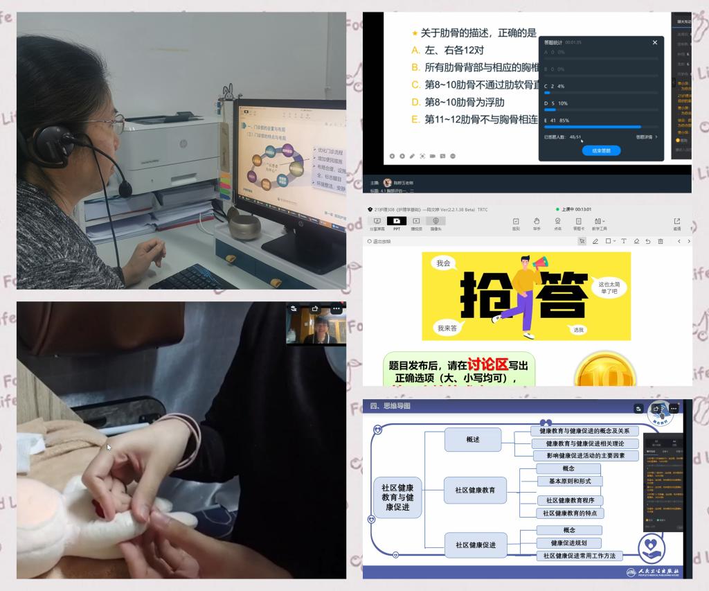 受疫情的影響,學(xué)校暫停線下教學(xué),開啟了將近一個(gè)月的線上授課。線上教學(xué)成為護(hù)理學(xué)院師生傳送知識、交流情感的紐帶。老師們結(jié)合課程特點(diǎn)和線上經(jīng)驗(yàn),積極調(diào)整教學(xué)方式和方法,一方面保證在“沒有眼神交流”的情況下盡量將知識點(diǎn)講透,還要輔以練習(xí)確保學(xué)生盡可能地掌握課程內(nèi)容;另一方面,結(jié)合網(wǎng)課的特點(diǎn)合理有效設(shè)計(jì)PPT、互動(dòng)環(huán)節(jié)、休息時(shí)間等,讓網(wǎng)課更加有“現(xiàn)場感”,同時(shí)又讓學(xué)生感受到老師的關(guān)心關(guān)愛,讓網(wǎng)課更加有“溫度”。