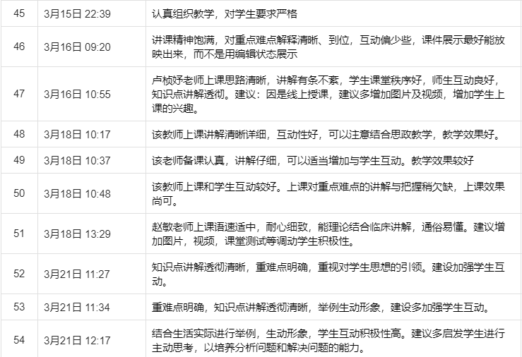 為了保障教學(xué)效果,護(hù)理學(xué)院的教學(xué)督導(dǎo)也實(shí)時(shí)跟進(jìn)。開學(xué)以來,護(hù)理學(xué)院共開展線上督導(dǎo)56次,就線上教學(xué)情況、課堂互動(dòng)效果等進(jìn)行評(píng)價(jià),并及時(shí)向授課老師反饋,與老師們共同探討線上授課的技巧,提升教學(xué)效果。