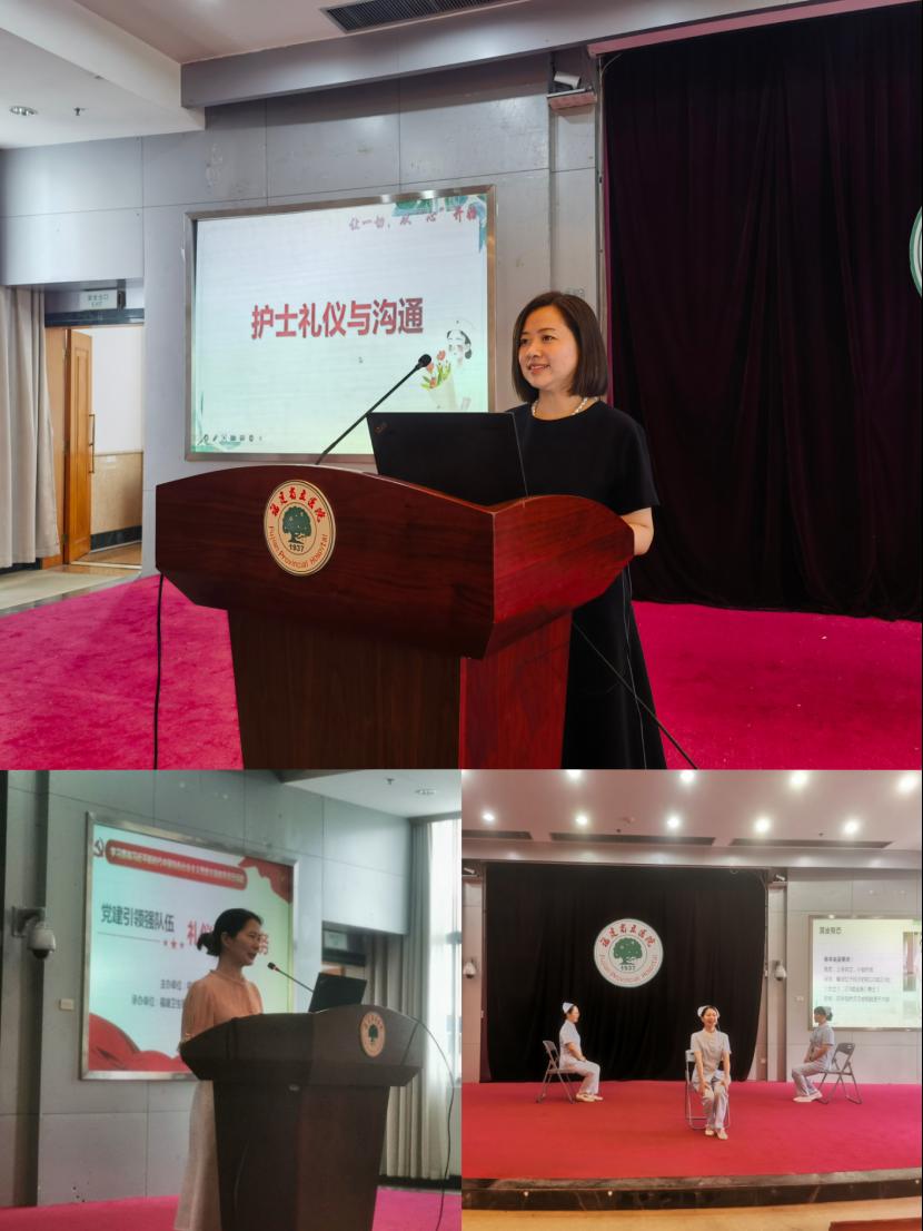 護(hù)理學(xué)院第一黨支部書記吳美丹同志以黨史學(xué)習(xí)教育微黨課《禮儀楷模周恩來》正式拉開培訓(xùn)序幕,激勵(lì)大家以周恩來總理為榜樣,將文明禮儀內(nèi)化為觀念、外化為行動,做到以心傳禮、以禮待人。隨后,護(hù)理學(xué)院第一黨支部第二黨小組組長、人文教研室主任劉菲菲同志開展《護(hù)士禮儀與溝通基本要求》專題講座,為新入職護(hù)士詳細(xì)講解護(hù)士儀容禮儀、服飾禮儀、舉止禮儀、護(hù)患溝通等職業(yè)禮儀的基本要求。吳美丹同志攜黨員教師賈箐箐、劉偉華同志進(jìn)行護(hù)理禮儀展示并組織大家集中練習(xí)。在培訓(xùn)中,強(qiáng)調(diào)護(hù)理禮儀的重要性,護(hù)理禮儀是護(hù)士工作的基礎(chǔ),直接關(guān)系到患者對醫(yī)院的印象和信任度,通過良好的護(hù)理禮儀和溫暖的護(hù)理服務(wù),能更好地與患者建立良好的溝通與信任關(guān)系,做到以患者為中心,提高護(hù)理質(zhì)量。