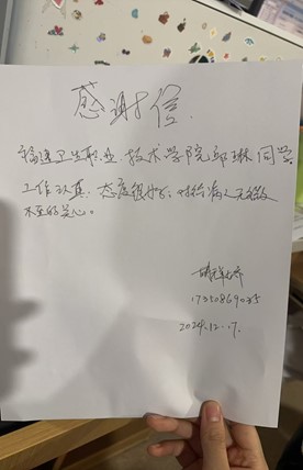 近日,護理學(xué)院22護理312班邱琳同學(xué),在廈門大學(xué)附屬第一醫(yī)院腎內(nèi)科實習(xí)期間,收到了住院患者的親筆感謝信??剖易o士長及科室老師也對邱琳同學(xué)的護理工作給予了高度認可。